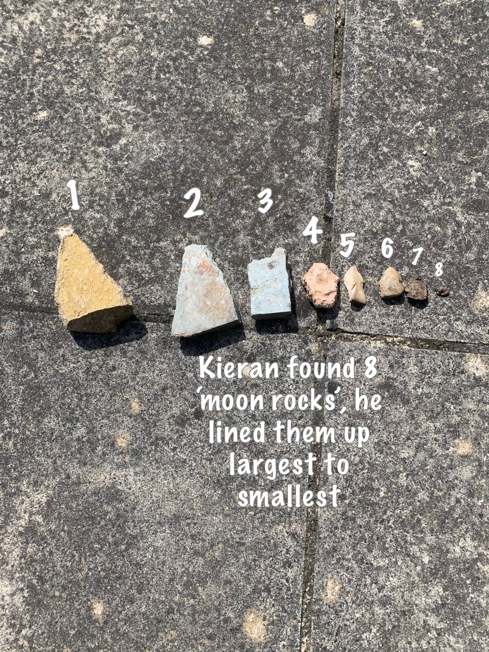 Kieran enjoyed finding stones which became his moon rocks which he ordered by size and counted. Can you find items around your house and arrange them or sort them in your own way and count them?